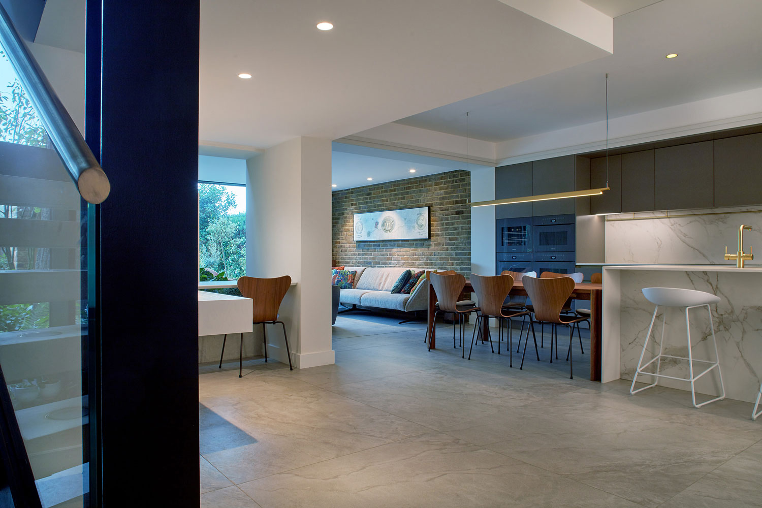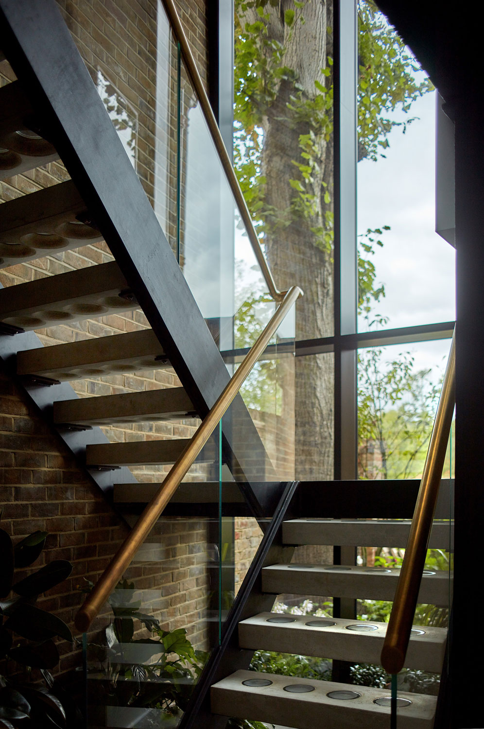 A unique and exacting brief in a picturesque pond-side location for a discerning client. We connected existing accommodation from above to below, either side of premises under different ownership via a new linking stair. Fulfilling a vision to create a waterside retreat complete with interior jungle and facility to bathe with views to the pond, we designed two modest brick and glass extensions to sit quietly within this sensitive Conservation Area. Playful brickwork details derived from local context were added, contributing interest and texture to the wall flanking a public footpath. Key features of the design are the glimpsed views of the ponds through apertures created by existing structural openings from deep within the plan; a glazed slot between old and new with a view through to a challenging TPO Lime tree and the ultimate open view of the dramatic land and water scapes framed by new larger span structure and glass. A circular skylight and double height curtain-wall glazing provide dappled light through a steel, concrete and glass stair to the internal planting below. A bathing area in the living space with pond views doubles up as ice bucket for social occasions. We provided the complete interior design service to include specialist lighting, bespoke kitchen and fitted furniture design, loose furniture and soft furnishings selection. Natural and warm, accented with bold, rich colours, the interior finishes aim to achieve an understated luxury that complements the expansive view of the natural landscape.